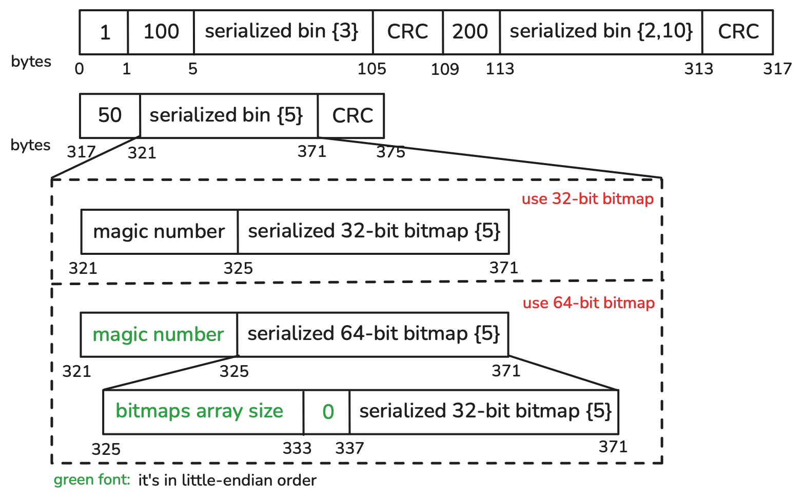 - Then, record the index by an int (LITTLE_ENDIAN) and serialized bytes of each bitmap in the array in sequence.